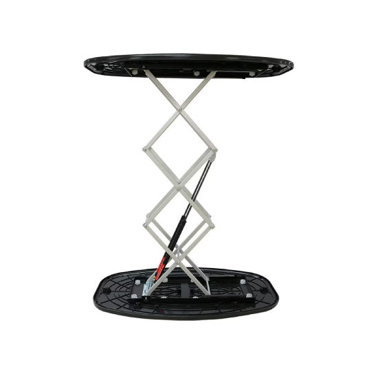 Pop Up Table's hydraulic shocks expand and collapse frame with a pull and push of your hands. Countertop can support up to 42 lbs. Our custom graphic wrap is dye sublimated multi stretch fabric.